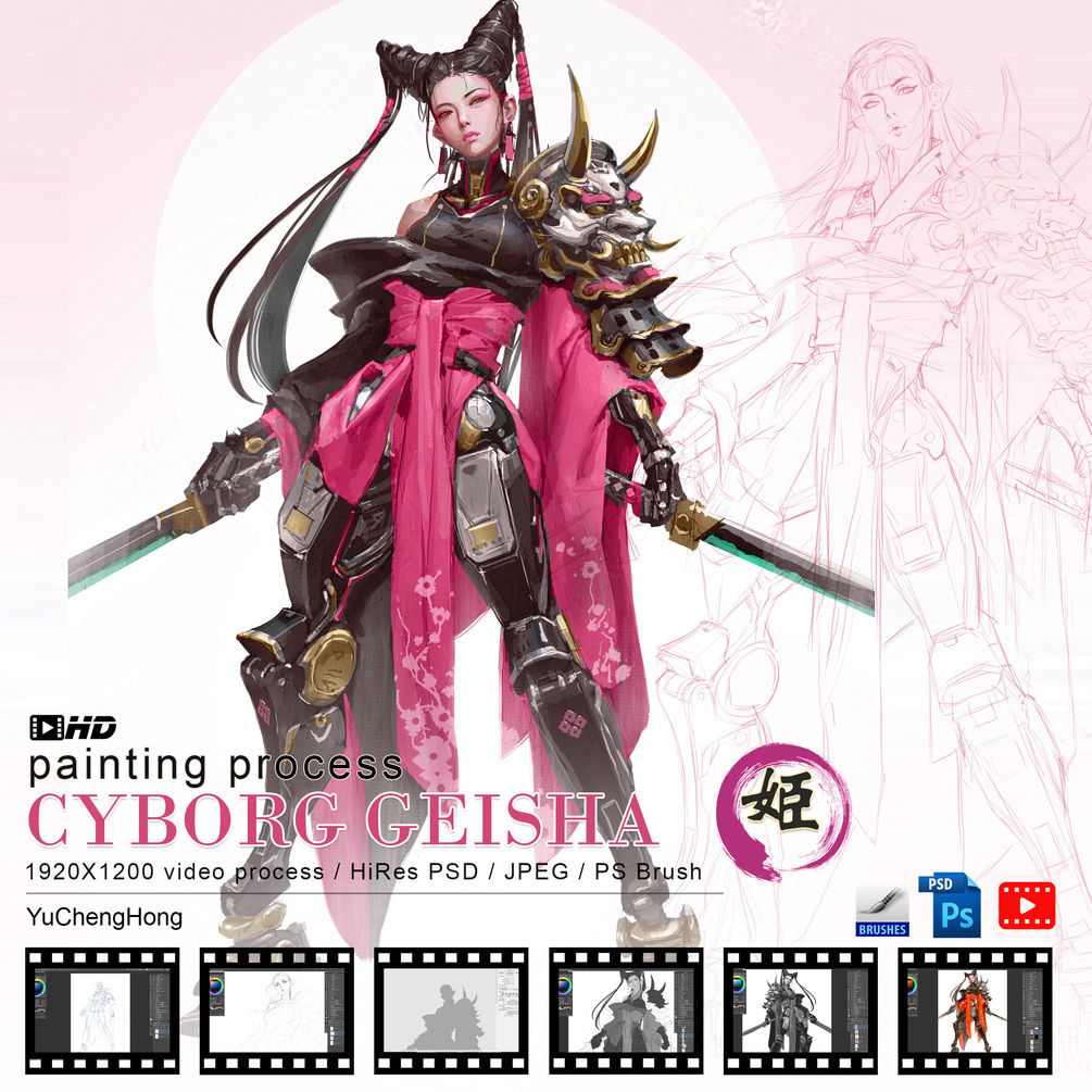 In this video, I’ll walk you through my process for drawing and painting a Cyborg Geisha. The steps covered include establishing line drawing to render, creating a rough sketch, blocking in black and white value , overlay colors, rendering, and color adjustment.
